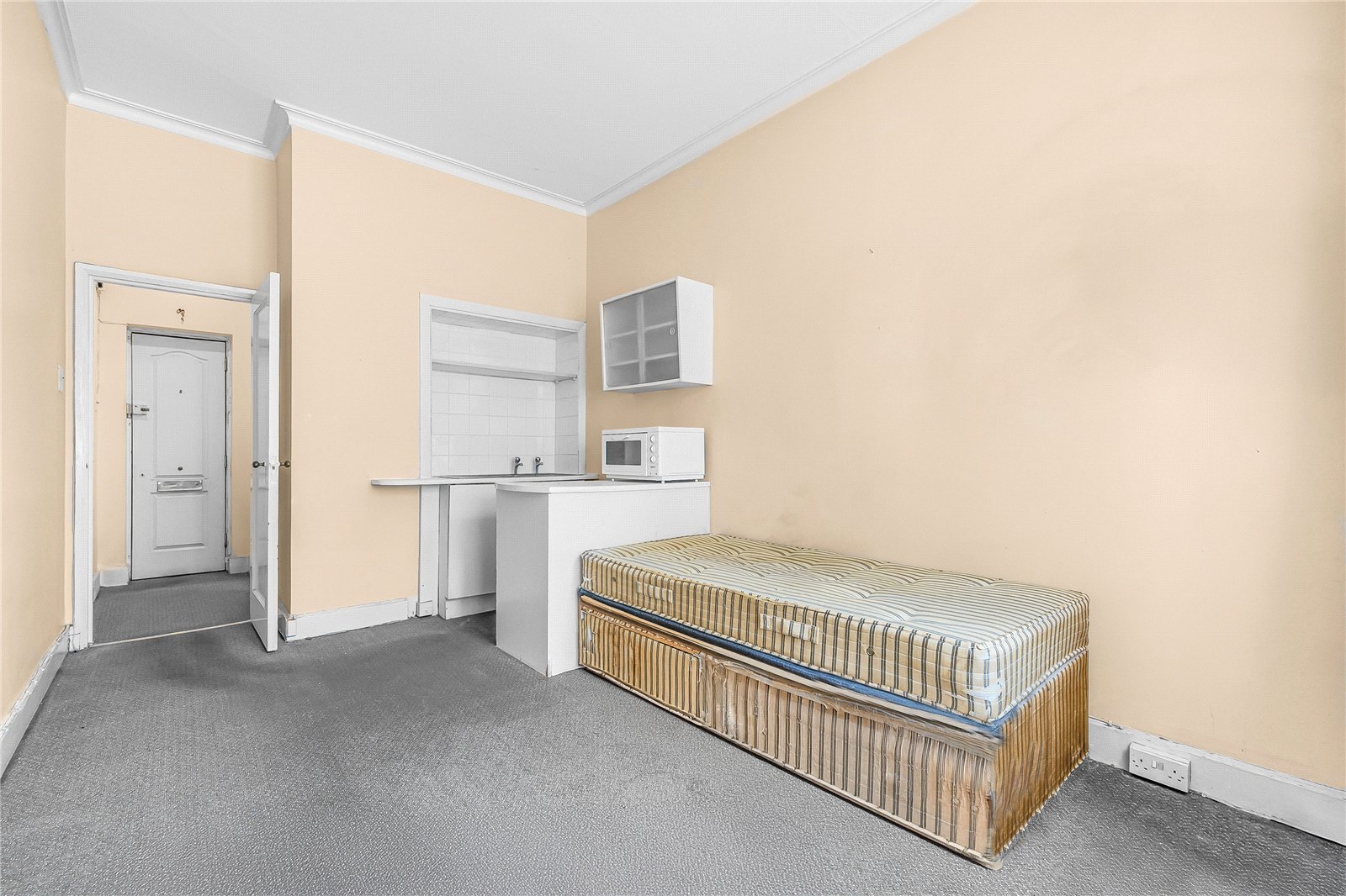 An UNMODERNISED studio apartment arranged over 205sqft / 19.05sqm and overlooking the communal roof gardens. The apartment is located on the ground floor of this well maintained portered block in the heart of St John’s Wood.